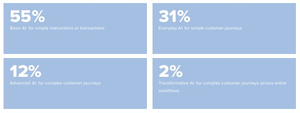 Understandably, relatively few brands have realised sophistication beyond this given the complexities involved, yet 12% are already deploying advanced AI solutions for complex customer journeys and 2% are working with transformative AI for complex customer journeys across entire workflows. Reaching these states of AI adoption is no small feat – it refers to a level of integration that provides brands with a distinct competitive edge. It doesn’t just refine existing processes – it redefines them. It can transform core business functions, driving automation, personalisation, and predictive capabilities to unprecedented heights, and chart a bold new course for the future of customer service.