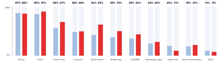CX teams are connecting with customers in more places, more often. Across the 10 most common support channels, engagement went down on 21 only two compared to last year: The use of phones (by a trivial one percentage point) and video chat (by nine percentage points). All the rest went up. Most meaningfully, email activity increased by six percentage points, online chat activity increased by 11 percentage points, social media activity increased by a massive 21 percentage points, and mobile app activity increased by 12 percentage points.