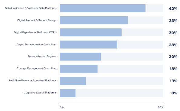 The most common investment domain over the next six to 12 months is data unification or customer data platforms: Just over four in 10 CX decision-makers (42%) are spotlighting this area. Behind that, 33% are looking to improve their digital product and service design, and similarly, 30% are planning to channel money into digital experience platforms. Rounding out the top five priorities, 28% will be tapping into digital transformation consultancy services and 20% are seeking to upgrade their personalisation engines.