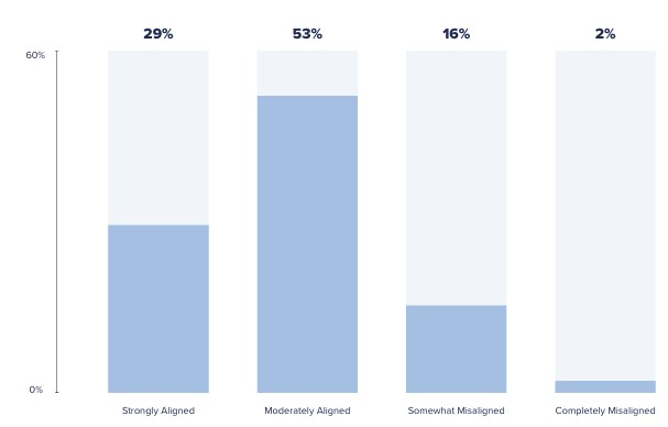 The indications are that most brands have laid the groundwork for seamless collaboration and are poised to take the next steps: Building clear momentum. Three in 10 brands already have strong alignment between their executive leadership and operational teams when it comes to driving holistic CX transformation initiatives, while 53% are a fraction behind in their pursuit with moderate alignment. Only 16% are somewhat misaligned and a minimal 2% are completely misaligned.