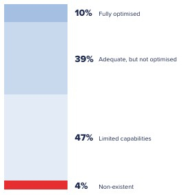 Fewer than half (46%) customer management leaders rate their customer experience across different channels as consistent, with a remarkably low 5% describing it as very consistent. In contrast, 22% assess their holistic customer experience as inconsistent and 5% say it is very inconsistent. Moreover – exacerbating this problem – only 47% collectively evaluate the quality of their customer insights as high or very high. Forty-three percent say they are average. The numbers also tell a strikingly similar story around how effective organisations are at transforming real-time customer data into actionable insights – a mere one in 10 say they have this process completely buttoned up, while 39% convey they have adequate capacity, a touch shy of full optimisation, and 47% say they only have limited capabilities.