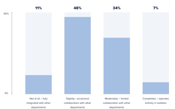 Digging deeper into the alignment panorama, a somewhat similar – albeit less evolved – pattern of development can be observed in the context of the contact centre. Eleven percent of customer management leaders say their contact centre is fully integrated with other departments, and just under one in two (48%) have occasional collaboration with other departments. Farther down the line, 34% only experience limited collaboration and 7% are operating completely in a silo.