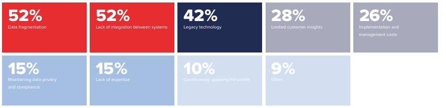 The biggest barriers organisations face in creating unified profiles is fragmentation and a lack of integration between systems – 52% of customer management leaders declaring as such respectively. Other major roadblocks include legacy technology, limited customer insights in the first instance, and implementation and management costs. A lack of internal expertise and maintaining data privacy also earn a mention.
